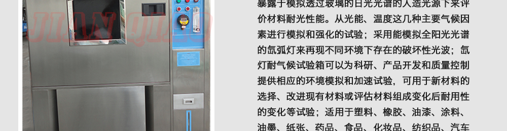 產(chǎn)品型號(hào):JQ-3F-100 品牌:劍 喬 用途:氙燈老化試驗(yàn)箱,氙燈耐候試驗(yàn)箱,氙燈光老化試驗(yàn)機(jī)是一種綜合氣候試驗(yàn)裝置,除進(jìn)行氣候老化試驗(yàn)外還可進(jìn)行高分材料的耐光性的測(cè)試,即高分子材料暴露于模擬透過玻璃的日光光譜的咨詢熱線:13829135130